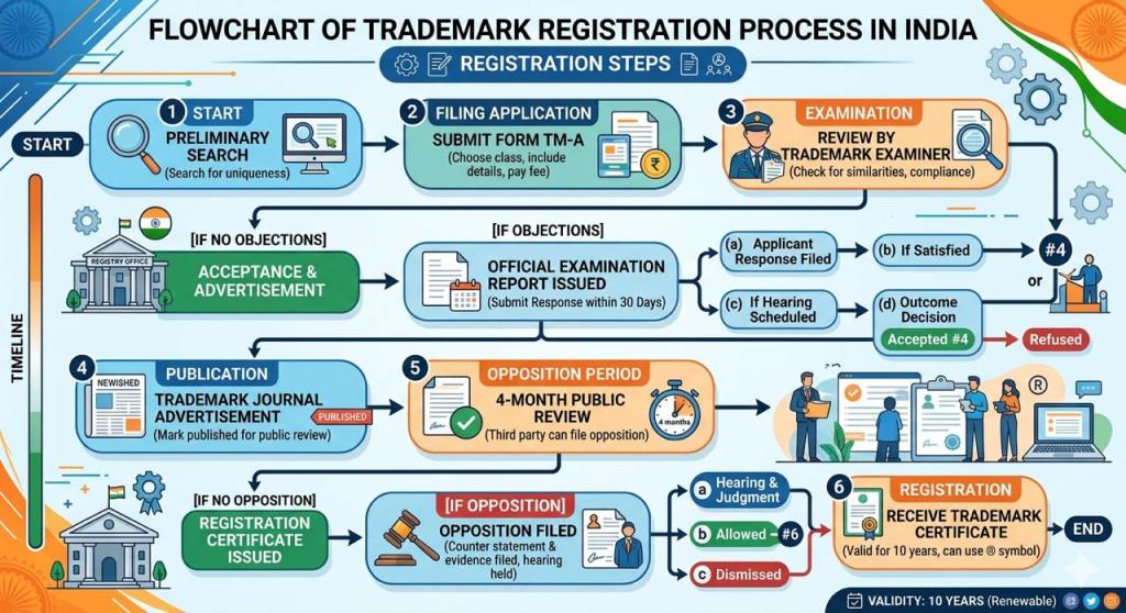 Hence, trademark application in India typically proceeds to registration over a span of roughly six to seven months, subject to procedural compliance and absence of objections or oppositions.